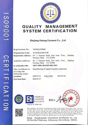 浙江歐騰服飾有限公司位于世界小商品之都-義烏。創(chuàng)立于2015年,是一家專業(yè)生產無縫針織運動服飾和內衣的工貿一體企業(yè),擁有自主出口權。 工廠的占地面積約16000平方米 ,引進了大型圣東尼、高騰等多種先進的制衣設備300余臺。月產能可達90萬件。 歐騰服飾每年投入近百萬資金打樣開發(fā)新產品,有著一支高素質設計、技術員工隊伍。工廠先后通過了ISO 9001質量管理體系認證、BSCI認證、GRS認證、OEKO-TEX國際生態(tài)紡織品認證等多項專利檢測報告。可提供OEM&ODM服務。歐騰服飾以一套完整、科學的質量管理體系,生產的服裝從原材料紗線到成衣,質量完全能夠滿足國內、國際質量要求。獲得了客戶一致好評。工廠先后獲得省科技型企業(yè)、國家高新企業(yè)、義烏市誠信講信用單位、規(guī)上企業(yè)、信用AAA級等榮譽。